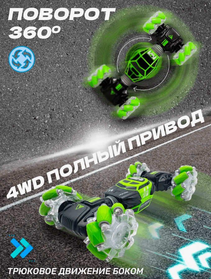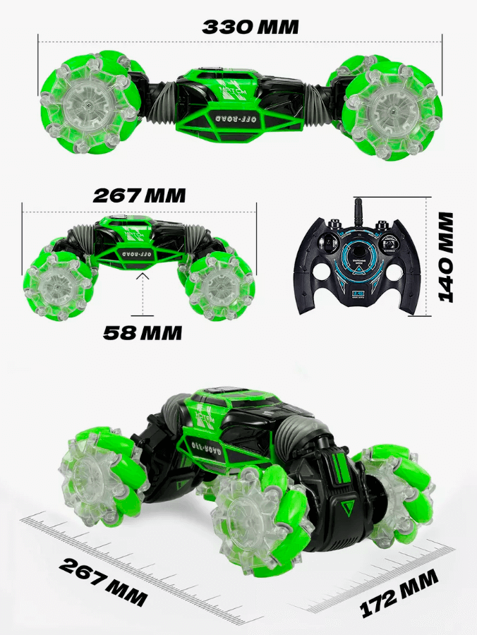 Машинка на пульте управления Skidding Stunt car – трюковая машина-перевертыш. Машинка на радиоуправлении и управлении жестами выполняет функции как гоночная машинка, как машинка вездеход, обладает повышенной проходимостью: ездит по бездорожью, песку, камням, траве благодаря наличию полного привода 4WD.